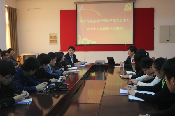 为全面贯彻落实党的十八届四中全会精神,10月25日,理学与信息科学学院组织全体学生党员在信息楼资料室召开“学习党的十八届四中全会精神”专题学习会,学院团委书记孙杰、正科级辅导员张照辉出席本次会议。