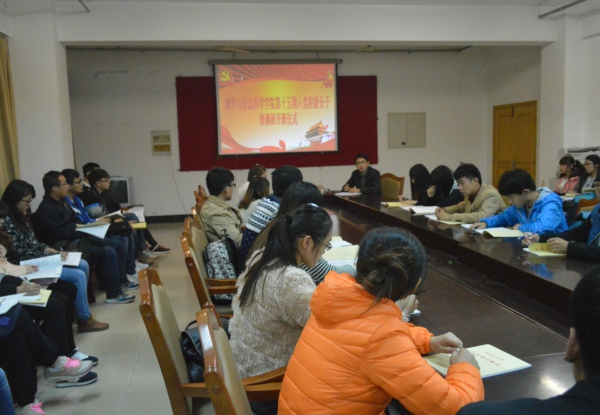 会议上,张照辉老师首先对参加本次培训班的学员表示欢迎,并对同学们的发展和成长寄予深切希望。紧接着他对全体学员进行了入党动机教育,要求全体学员高度重视入党积极分子的培训,严肃纪律,进一步端正入党动机,并教育全体学员如何以实际行动争取做一名光荣的共产党员。最后,张照辉老师给大家介绍了本次培训班的培训安排及考试安排,并带领同学们一起学习了入党培训教材。