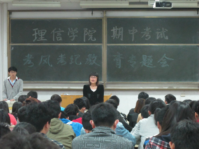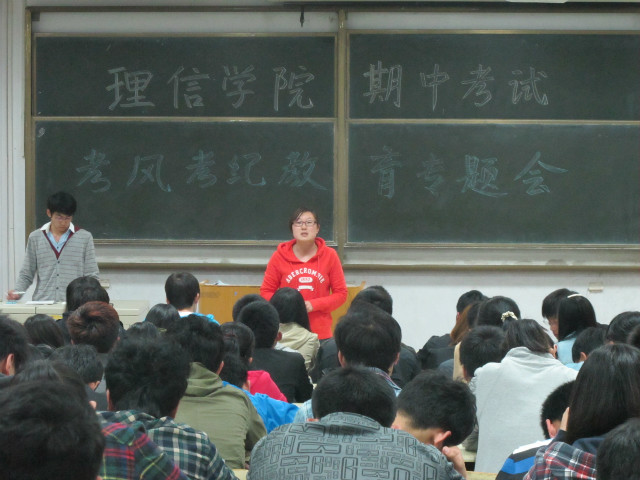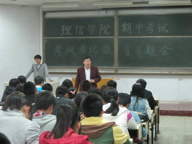 在期中考试即将来临之际,为进一步加强考场纪律、严肃考风考纪, 5月2日,理学与信息科学学院在教学楼B102召开了期中考试考风考纪教育专题会议,学院团委书记曹银娣、正科级辅导员孙杰、团委副书记刘艳研出席了会议。