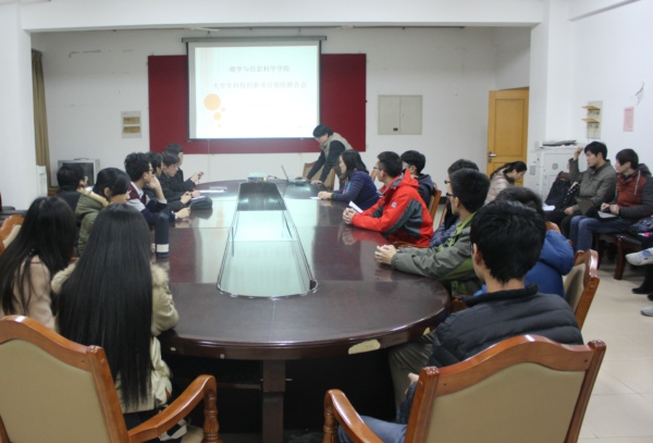 按照学校《关于评选应用型人才培养特色名校建设工程2014大学生科技创新项目的通知》的要求,12月3日晚,理学与信息科学学院在信息楼资料室召开大学生科技创新项目验收报告会,学院副院长陈龙猛,学院创新立项评选委员会专业老师以及教学管理人员张艳老师、李建国老师参加了验收报告会。