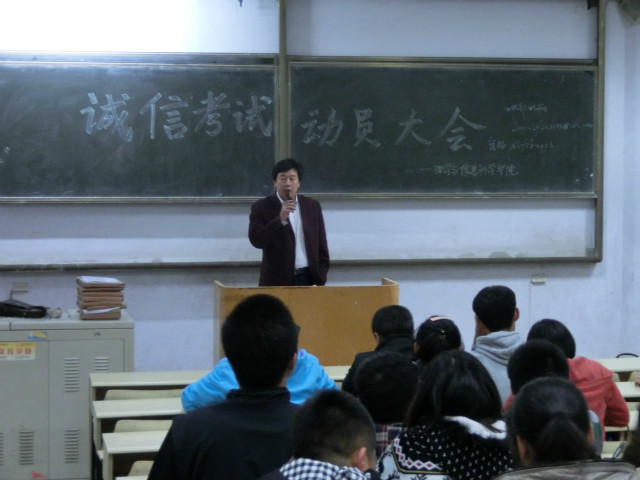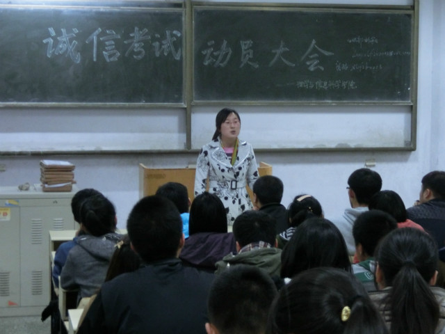 为加强学风建设,严肃期中考试考风,10月24日,理学与信息科学学院在教学区B102召开诚信考试动员大会。学院团委书记孙杰,团委副书记刘艳妍,辅导员王甜甜以及全体学生干部参加本次会议。 会上,孙书记首先强调,临近期中考试,全体同学在考试中,应自觉遵守考场纪律,杜绝各种考试违纪舞弊行为,展现自我水平,用真实的成绩证明自己的实力。随后,要求各班级及时组织诚信考试主题班会,尤其是13级的负责人要及时在班里召开诚信考试动员大会,强调考风、考纪。最后,提醒同学们考试前要及时通知学生带好考试的相关证件,同时,在考试期间严格请假制度,严禁无故旷考。 诚信是为人之本,诚信考试是每一位同学的义务。本次会议,为期中考试的顺利进行做好铺垫。