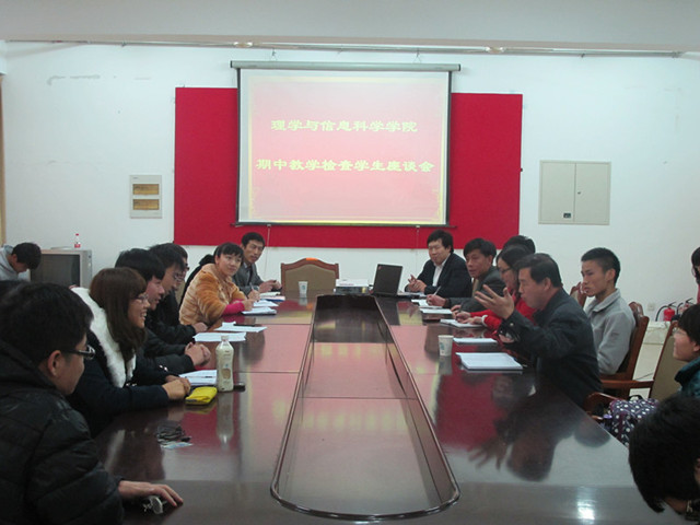 11月16日下午,理学与信息科学学院在信息楼资料室召开了期中教学检查学生座谈会。学院教学副院长吴自库,教学秘书张艳,教务员姜静,督导老师刘杰、常程娟,正科级辅导员孙杰出席了本次会议。