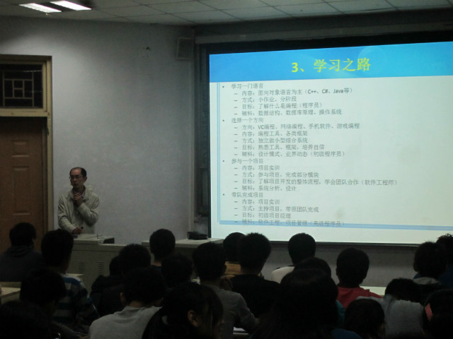 会上,熊凯老师向大家简单介绍了编程的重要性及学习编程的原因,同时他强调做编程是一个枯燥的工作,希望同学们能够全心身投入,要有信心和决心,确定了一个方向之后就要坚持下去。谈及学习计算机之路,他还列举出他的团队和成员的平时表现,为同学们带来了正能量,鼓励同学们要明确目标,对学习计算机充满希望。回顾团队的成长历程,熊凯老师向大家展示了团队取得的成绩并告诉同学们成功的关键在于要有良好的人品、正确的方法和团队意识。同学们认真听取了报告会,还针对性的提出了问题并得到了老师的耐心讲解。最后,熊凯老师祝愿同学们会在下一个十年会成为计算机界的主角。