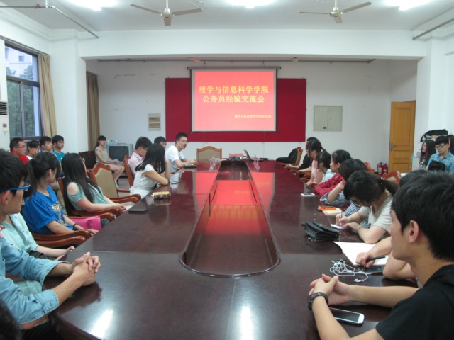 为帮助广大考生充分认识与了解公务员考试,6月14日晚,理学与信息科学学院在信息楼资料室215举办了公务员考试经验交流会,理信学院2014年成功考取公务员的代表受邀到现场座谈。