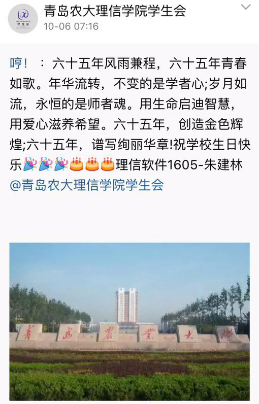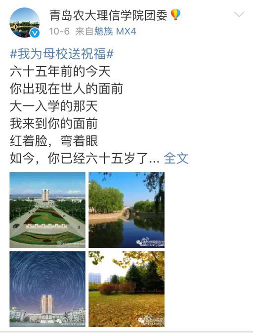 句句环绕祝福,字字凝聚真情。微博响应,字里行间,理信学院恭贺校庆。一行行文字,一幅幅景图,呈现着醉美青农,也展现着真情流露。