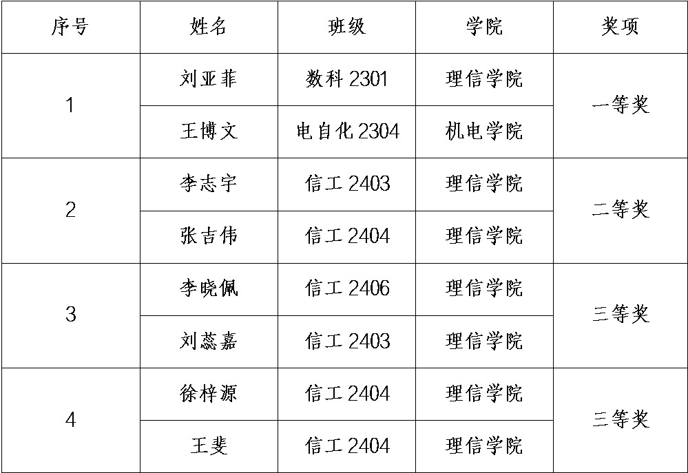 大学生新一代信息通信科技大赛(原“大唐杯”全国大学生新一代信息通信技术大赛),是由工业和信息化部人才交流中心、中国通信企业协会、中信科移动通信技术股份有限公司主办,北京邮电大学、电子科技大学、天津大学等高等院校承办的全国性创新实践型竞赛。大赛已经连续多年列入中国高等教育学会“全国普通高校大学生竞赛分析报告”,已成为国内新一代信息通信领域极具权威性与影响力的创新竞赛品牌。我校于2026年3月30日举办了青岛农业大学大学生新一代信息通信科技大赛,本次大赛由创新创业学院主办、理学与信息科学学院承办,共7组队伍报名参加,每组队伍2人,评审委员会对各参赛学生的校赛竞赛试卷进行了认真仔细的批阅,大赛最终评选出校级一等奖1组、校级二等奖1组、校级三等奖2组,具体名单如下: