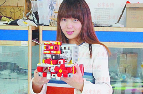 在人类未来的深海家园有一个守卫者——仿生机器人“鳄龟”,它能护送人类回家,能迅速灭火,能抢救落水的人,还能探测海上油井,实现海上风力发电……这是青岛农业大学物联网专业学生范佳玲和同学花了3个多月设计的“深海未来家园”作品,在11月15日举行的第十五届“能力风暴杯”中国教育机器人大赛中获一等奖。