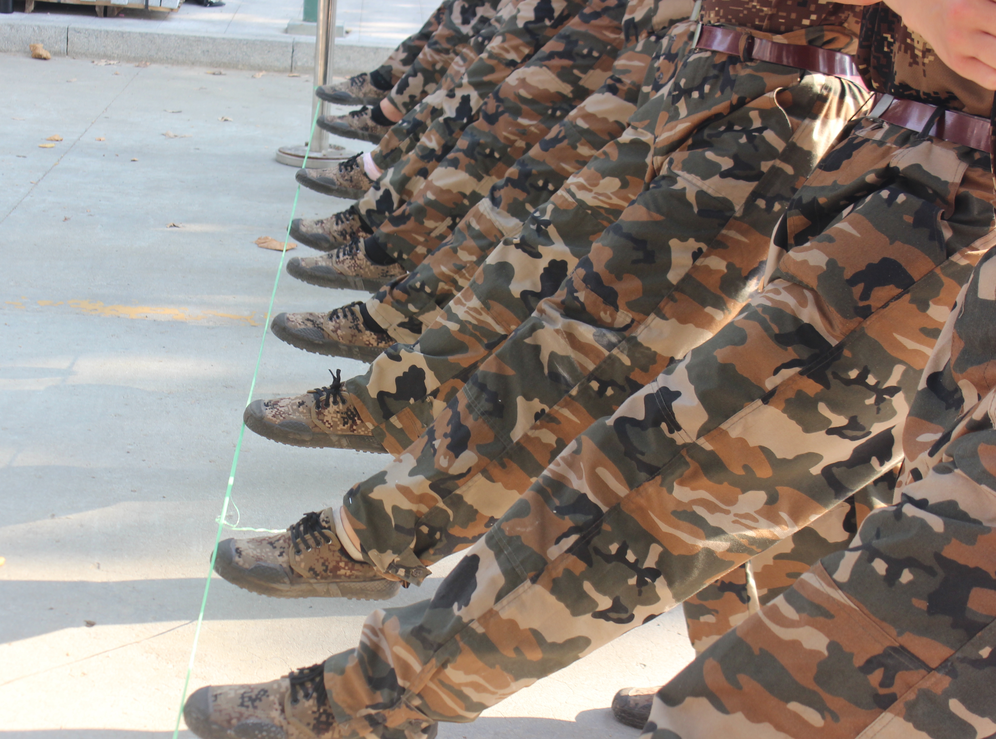 “宝剑锋从磨砺出,梅花香自苦寒来”,教官严格训练,拉线严控踢正步幅度、腿夹纸牌严矫军姿仪态等等。短短几天的相识交融,小小的集体,迈着“日日夜夜”,踏着“无怨无悔”。齐步走、正步走、齐步变正步、解散、集合及分列式等预定训练科目已初见成效。曦晨抚摸大地,有新生们刚毅充满活力的脸庞。听吧!在这里,一群身穿迷彩的活力青年,让我们把新征程号角吹响!