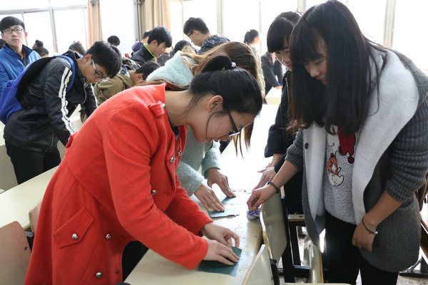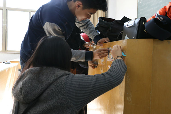 为积极培育和践行社会主义核心价值观,贯彻落实《关于在学生中开展“八个倡导,四个禁止”校园文明主题教育活动的通知》,进一步加强大学生思想道德建设,促进大学生基础文明养成,提高学生综合素质,创建文明和谐校园文化以及清新的学习环境, 11月17日,理学与信息科学学院响应学校的号召,在教学区开展告别“课桌文化”清理活动,辅导员刘菲老师、理信学院全体入党积极分子、理信学院义工以及2015级新生等400余人加入到这次活动中来。“课桌文化”指课桌上人为留下的各种广告、涂鸦等,它们在各教室中无处不在,破坏了学习环境的整洁。 首先,刘菲老师向同学们阐述了活动的意义,刘老师表示此次活动是为了还原教学区的整洁明亮,使同学们的学习环境更加干净舒适,提醒同学们拒绝“课桌文化”从自身做起,并组织同学们进行清理活动,调动同学们的积极性,呼吁大家自觉保持教学区卫生。随后,刘老师加入到同学们中,一起对教学区内课桌上的小广告、黑板上的胶带痕迹等进行彻底清理,努力打扫教室卫生,清除教室内的污渍。在老师的带动下,参加此次活动的同学们一起将学院所分配的清洁区打扫的干干净净,让教室恢复了往日的明亮。同学们在经过一番劳动后,方知平日里不注意保护教室等公共场所卫生,日后再清理起来有多么辛苦,因此纷纷表示以后会拒绝“课桌文化”,爱护教室环境,爱护学校环境。