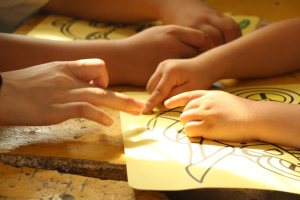 手工课是教孩子们画沙画。队员们将准备好的材料分发到每一位小朋友的面前,并认真地教给孩子们图沙画的方法,孩子们一边填涂,一边看着其他小朋友的图画进度,乐此不疲。