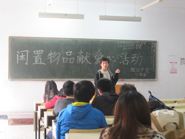 会上,心理部部长苗刚向大家传达了闲置物品献爱心活动的通知,号召大家把自己闲置的物品捐献给贫困地区。闲置物品献爱心活动不仅激发了同学们热心奉献的热情,还为社会扶贫贡献了我们的一份力量,同学们进行了热烈的讨论并纷纷表示将积极参加本次活动。最后,心理部安排了填写心理反馈表的事宜,并希望大家如实认真填写以更准确地了解同学们的心理健康状况。