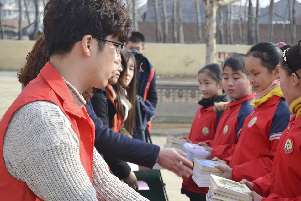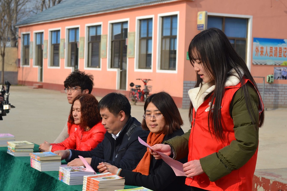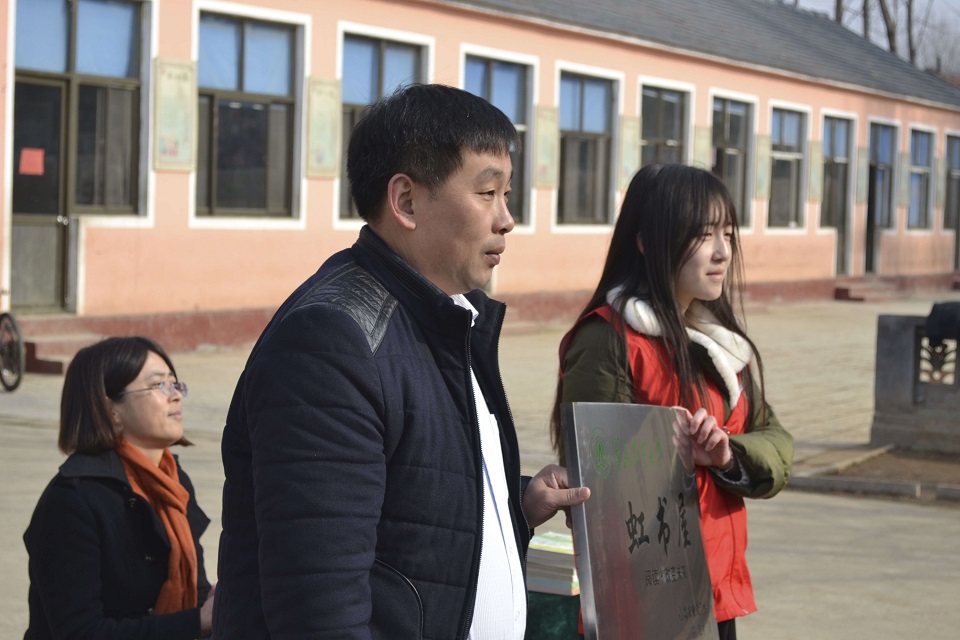 仪式伊始,在场的全体成员在国歌声中摘帽礼敬,孩子们还随着旋律唱起了国歌。泛海希望小学的校长于伟对此次仪式进行致辞:“祝愿青岛农业大学虹书屋协会能够继续发扬志愿精神,传承阅读文化,同时也希望同学们能够发扬阅读精神,推动沂蒙教育事业的发展,更上一层楼!”从校长的话语中,虹客们能够感受到校长对虹书屋美好的祝愿和感谢之情,对学校阅读事业的重视。随后虹书屋代表和小学代表一起进行了揭牌仪式,学生代表上台一同进行授书仪式并留影纪念。