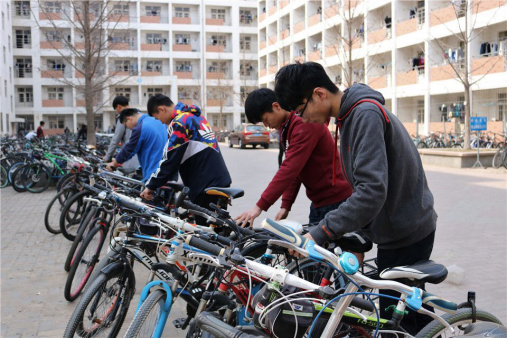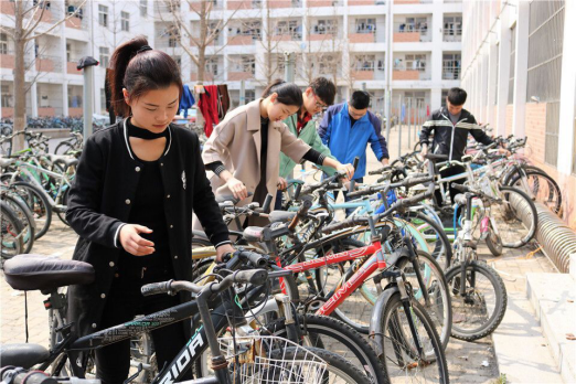 面对随意乱放的自行车,同学们没有一句埋怨,无人偷懒,无人早退,工作态度十分积极。不少女生也参加到这次活动中,面对自行车上的油污灰尘,她们没有皱眉,全身心地投入到此次活动中来。活动过程中存在很多困难,如几辆自行车同时锁在一起扔在一旁,这样让搬运工作显得困难许多。但在大家的共同努力之下,一个个困难迎刃而解,原来乱停乱放、东倒西歪的自行车被他们勤劳的双手给摆放地整整齐齐,这些自行车成为校园几道亮丽的风景线。