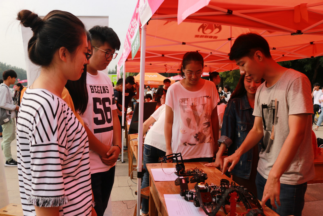 “想实现机器人智能化必须要添加另外的主控,也就是给机器人装个大脑,这里我们采用arduino芯片,随后在主控上添加各种传感器模块,就相当于给机器人安上了口鼻眼耳等等,这样便初步形成了机器人的智能化框架。”理信学院机器人创新实验室刘超运用自己所学的专业知识为新生和家长做了详细的解释,让新生对今年首次招生的机器人与人工智能方向有了初步的了解与认识。