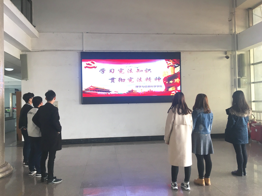 为更好的宣传宪法精神,理信学院在信息楼一楼大厅LED屏幕放映“学习宪法”主题的宣传图片,大屏幕滚动播放“新宪法 新修改”、“学习宪法知识 贯彻宪法精神”等主题宣传页面,不时引人驻足,真正做到让宪法精神普及到每一位同学、每一位老师。