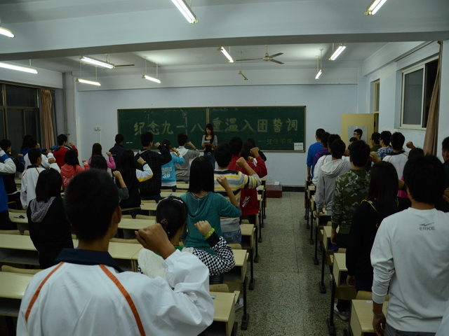 为纪念九•一八事变80周年,牢记历史、不忘过去,培养同学们勇于创新、团结自强、振兴中华的精神,理学与信息科学学院于9月18日晚利用新生校规校纪考试之机在教学楼举行了“纪念九一八·重温入团誓词”大会。团总支书记杨凯、辅导员刘艳妍、孙海涛,11级全体学生参加了此次大会。