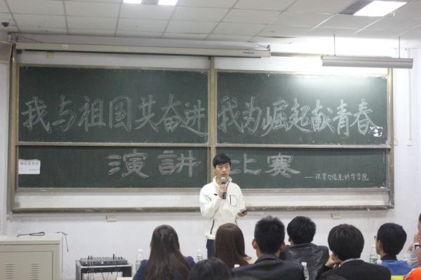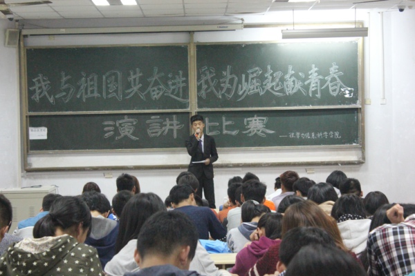 10月19日,青岛农业大学理学与信息科学学院在教学区举行了“我与祖国共奋进,我为崛起献青春”演讲比赛,学院学生会各部部长担任演讲比赛的评委。