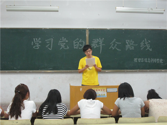 为加强同学们对党的建设的深刻认识,增进同学们对党的群众路线的了解,8月25日,理学与信息科学学院在教学楼开展了新学期第一次团课教育活动,理信学院全体学生参加了此次活动。