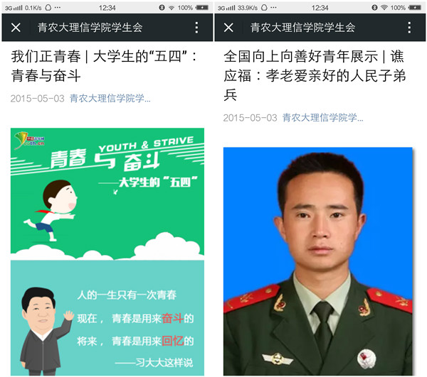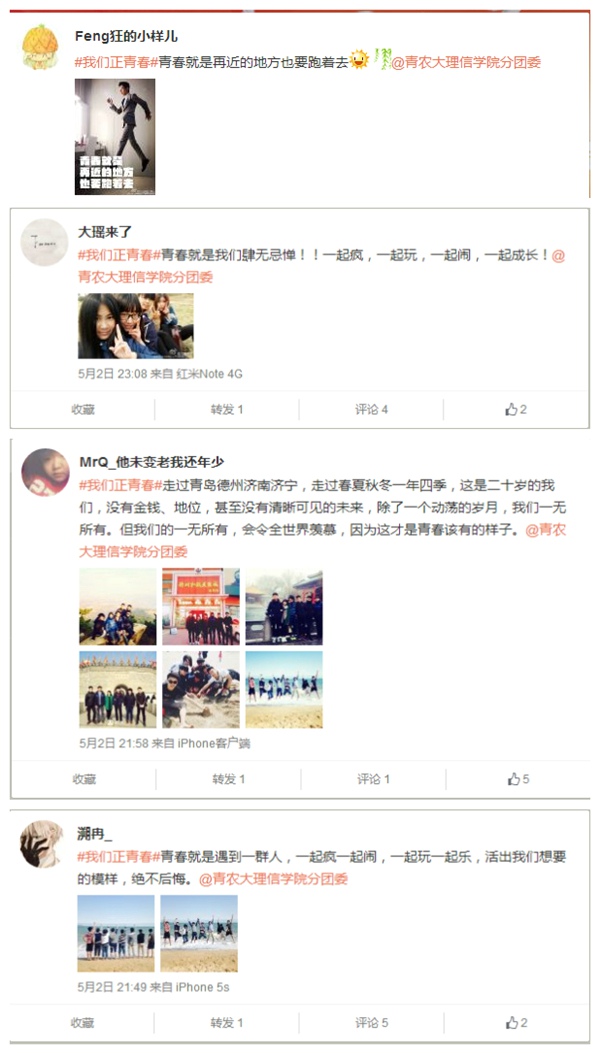 本次活动学院通过青农大理信学院分团委官方新浪微博和青农大理信学院学生会微信公众平台发起活动号召,邀请全院青年学生利用微博、微信展示与青春有关的照片或视频,加上对青春的理解,鼓励团员青年大声说出自己的青春信仰,继承五四精神。学院微信平台还推出“全国向上向善好青年展示”专题板块,宣传优秀青年典型,引导学院青年学生见贤思齐、崇德向善。