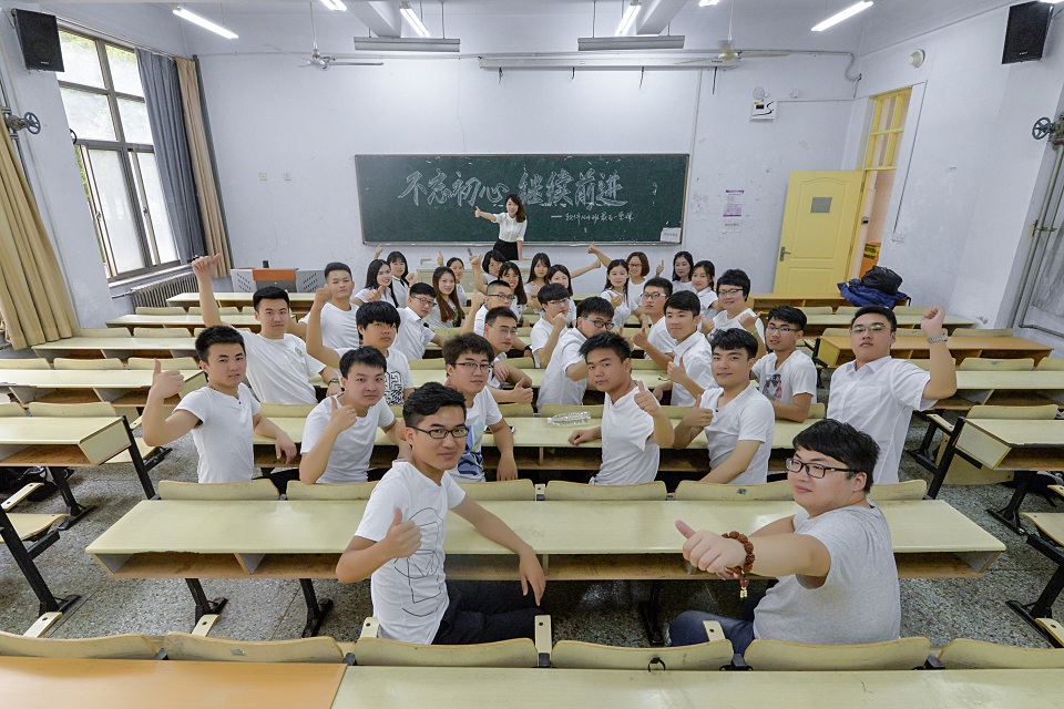 班会课首先播放了大学四年的照片集,看着自己大学四年的过往和点点滴滴,许多人的眼眶渐渐湿润。不忘初心,继续前进是班主任老师拿出了保存四年的大一第一堂班会课时每个人写下的大学四年的目标和梦想,每个人再将四年前对自己的期望读出来,“成为软件王”、“拥有自己的开发团队”……很多都已实现,也许还有遗憾,但都是努力的模样,在此基础上大家继续制定了三年的小目标;不忘初心,继续前进是班委收集了大一入学时的证件照,并组织拍摄了穿着西装的职业照,一瞥一笑之间尽是成长的模样,两张照片的鲜明对比,是同学们抛去曾经的稚嫩,背负梦想继续前进的宣言;不忘初心,继续前进是在同一间班会教室再一次比出“people is OK”的手势,为自己点赞,迎接四年后更好自己的模样,并将勇敢奔赴前程。