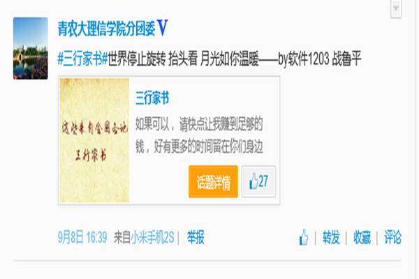 “一封封家书,一份份真情”,学生们离开父母,适逢中秋佳节,他们把平时没有对父母说的心里话写在纸上,把对父母的感激写在纸上,把对父母的爱写在纸上,把对父母的祝福写在纸上,虽然只有短短三行,但却表达了他们心中对父母的爱。理信学院从参加的同学中选出优秀作品发布到学院新浪微博、人人网公众主页和微信公众平台上,让这份爱继续转发、传递。