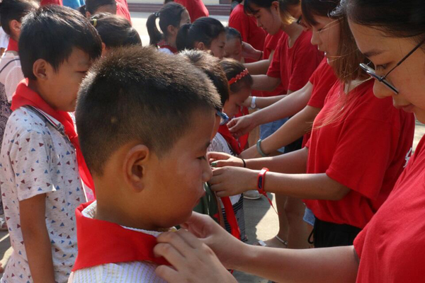 升旗仪式的第一项便是要佩戴红领巾,这也是此次升旗仪式最具特色的项目。队员们教给孩子们佩戴红领巾的正确方法,然后再由高年级同学为低年级的同学进行佩戴。佩戴上红领巾的孩子们一个个笑靥如花,鲜红明亮的红领巾在清晨阳光的照耀下显得格外鲜艳美丽,它飘扬在孩子们的胸前,象征着祖国的希望与未来。