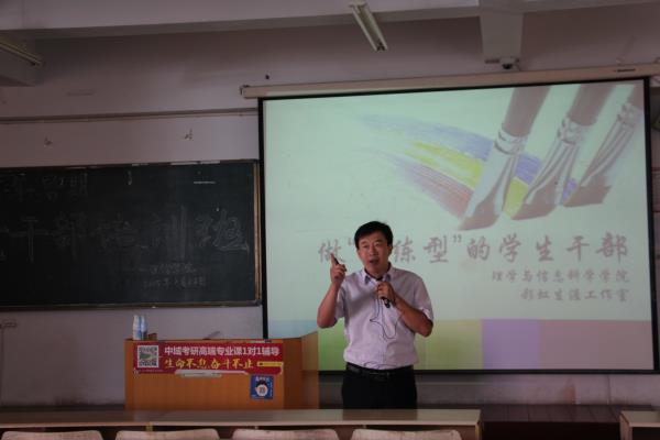 为进一步提高学生干部队伍的整体素质,充分发挥学生干部的模范带头作用、桥梁纽带作用和得力助手作用,理学与信息科学学院创新工作方法,锐意进取,将教练技术运用到学生干部培训中,于8月22日分五个教室举办了以“做‘教练型’的学生干部”为主题的2015年暑期学生干部培训班,青岛农业大学彩虹生涯工作室主持人、理信学院党委副书记、副院长杨凯,团委书记孙杰,正科级辅导员张照辉、刘艳妍,辅导员王甜甜、刘菲分别进行专题讲座,学院近400名学生干部参加本次培训班。