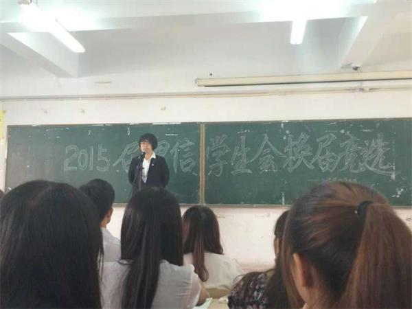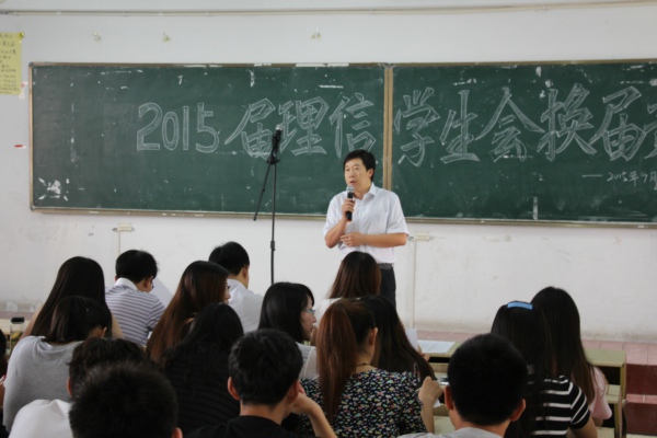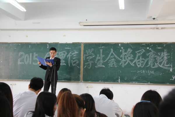 7月5日,青岛农业大学理学与信息科学学院在教学区C211进行了2015届学生会换届竞选。理信学院党委副书记、副院长杨凯,团委书记孙杰,正科级辅导员张照辉,辅导员王甜甜出席并担任评委。同时2014届学生会主席、各部部长和各班班长团支书到场为参与竞选的选手打分。