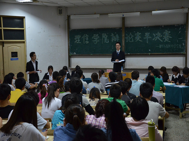 5月6日晚,理学与信息科学学院在教学楼D区103教室举行辩论赛半决赛,此次辩论赛分上下两场,辩题分别为“互联网使人更亲近还是更疏远”、“高等教育应宽进严出还是严进宽出”。2010届曾任学生会各部部长、2011届现任学生会各部部长作为本次辩论赛的评委进行了观看并点评。辩论期间,正反双方直击辩题重点,引经据典,唇枪舌剑,妙语连珠,既有对原则性问题的反复争论,也有避敌锋芒的技巧性回避。