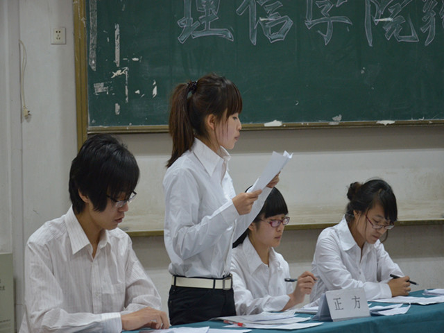 比赛开始后,场上双方辩手你来我往,唇枪舌战,围绕着辩题“信息时代是否需要读书破万卷”展开了激烈的辩论。辩论中选手们依然不失风度,始终面带微笑,侃侃而谈,并巧妙的利用各种技巧,如“瞒天过海”“偷换概念”等。双方选手在立论,驳立论,功辩等各个环节中思路清晰,引经据典,字字珠玑,使现场气氛迅速升温。在随后进行的自由辩论环节中,双方选手就辩题展开更深层次的辩论。良好的风范、出色的口才、敏捷的思维令场下观众为之折服,掌声不断。最后,现场的评委对本次辩论赛做了精彩的点评,指出了双方的优点和不足,并期待大家在今后比赛中的不断进步。