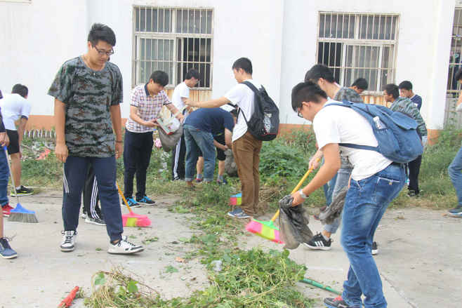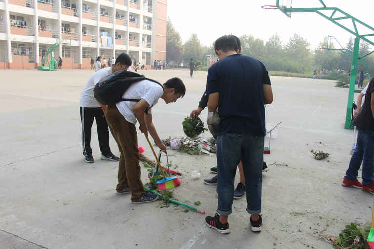 9月19日下午,学院召开学生干部会议对活动进行统一安排,并详细地介绍了活动内容和要求。几个男同学用大扫帚对主干道进行了大刀阔斧的“改造”,另一些男同学在树木周围拔草清理宿舍后面的灌木,女同学们则拿着小扫帚和簸箕收拾自行车周围的垃圾和杂草。孙杰老师和杨凯老师帮忙打扫卫生时不时的提醒同学们注意安全。并在活动结束后对任务完成情况进行了全面检查此外还对大家的积极表现提出了表扬。