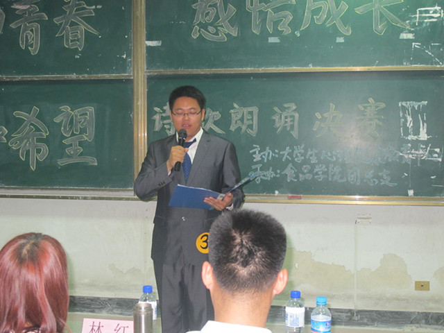 5月20日晚,校大学生心理健康节活动“舞动青春,感悟成长,播种希望”诗歌朗诵大赛决赛在D区303教室如期举行,理学与信息科学学院宫振兴同学脱颖而出,成功晋级到本次决赛。本次大赛围绕“青春 成长 希望”这个主题展开,在初赛的选拔之后,共有19组选手参加了本次朗诵大赛决赛。我院宫振兴同学第三个出场,朗诵的诗歌题目是《青春的赞歌》,凭借着饱满的热情,优美纯正的语音,辅以优美的旋律向现场观众奉献了一场精彩的诗歌朗诵,博得了大家阵阵掌声。此次朗诵比赛充分展示了我院学子积极向上的精神风貌,丰富了校园课余文化生活,让青年人更加懂得了珍惜青春,拥抱青春。