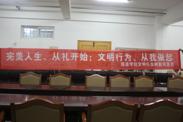 高等院校是为国家培养人才的场所,是建设社会主义精神文明的阵地,应当成为全社会讲文明、讲礼貌的楷模。学习《大学生日常行为规范》不仅有助于促进良好风气的形成,而且有利于青年学生的优良品德的培养。活动期间,学院在学生出行区域进行“告别陋习,文明修身”宣传,广泛宣传大学生行为规范知识,并动员同学们加入到签名活动中,个性鲜明的海报展示吸引众多同学驻足观看和积极参与。