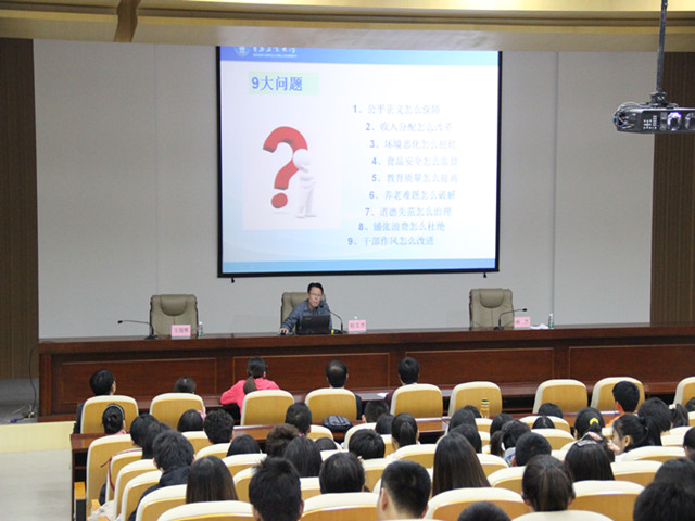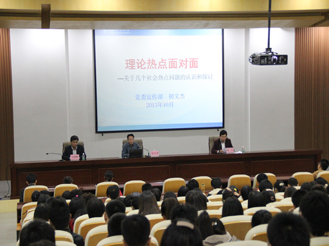 为了让党员深刻了解时政热点。10月23日晚上,理学与信息科学学院在学术会馆开展“理性看,齐心办,理论热点面对面”主题讲座。校党委宣传部副部长初文杰、校督查组学工部资管管理中心主任王国辉、理信学院团委书记孙杰、正科级辅导员张照辉、团委副书记刘艳妍、以及辅导员王甜甜参加讲座。学生党员、预备党员和学生干部共同听取了此次讲座。 会上,首先由初部长就公平问题,收入问题、环境恶化问题和道德失范等问题为同学们做出了深入讲解。讲座形象生动,引人入胜,深入浅出,幻灯片图文并茂,同学们听后受益匪浅。之后王国辉主任借此机会对学生党员、预备党员和学生干部提出了学生应该要深入推进党的群众路线,将个人成长和实践相结合,培养良好的个人学习习惯等几点希望。 通过此次讲座,同学们收获颇多,对社会热点有了新的认识,对深入贯彻党的群众路线有了新的理解和体会。为今后的学习与工作打下坚实的思想基础。相信同学们一定会为理学与信息科学学院日后的发展做出更大的贡献。