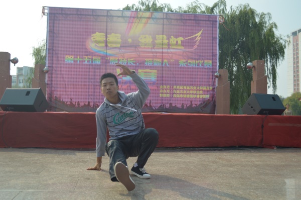 那踏节的盘和鼓已经摆好,他从容而舞,形舒意广。开始的动作,像是俯身,又像是仰望;像是来、又像是往。罗永川同学用一曲《Breaking》俘获了观众的心,取得了舞蹈组前八名的好成绩。