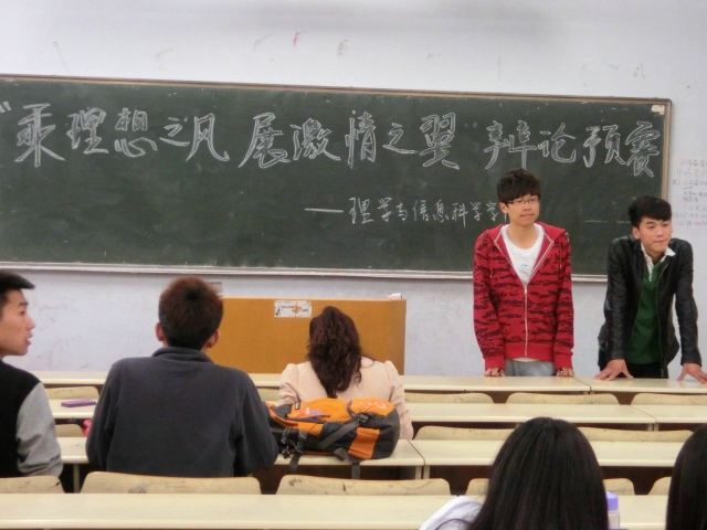 为迎接大学生科技文化艺术节,锻炼学生的应变与表达能力,5月8日,理学与信息科学学院在教学区举行“乘理想之风,展激情之翼”辩论赛预赛。本次辩论的主题是“外来文明对中国文明的利与弊”。
