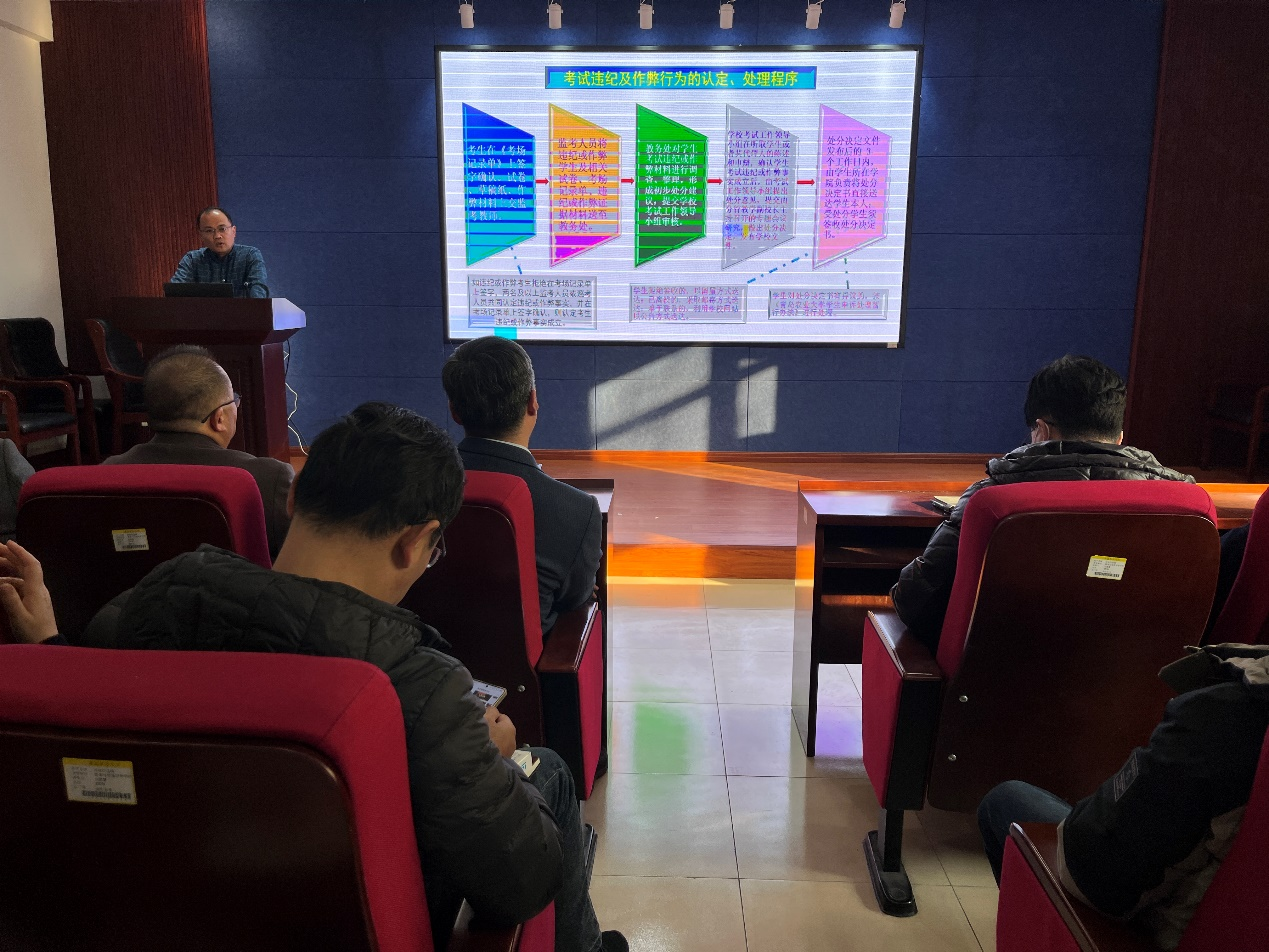 随后,刘振斌详细解读了学校教师监考专项培训的各项要求,明确了从命题审核、试卷印制保管、考场安排、监考巡考到成绩提交归档的全流程时间节点与责任人,确保各项工作环环相扣,责任到人。