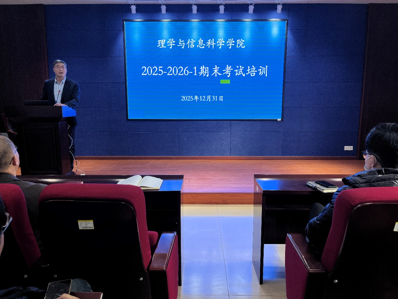 为确保本学期期末考试工作平稳、规范、有序进行,12月31日下午,理学与信息科学学院在信息楼315会议室召开了2025-2026-1学期期末考试培训会议。学院党政领导、全体任课教师及教学管理人员参加了本次会议。会议由学院副院长刘振斌主持。