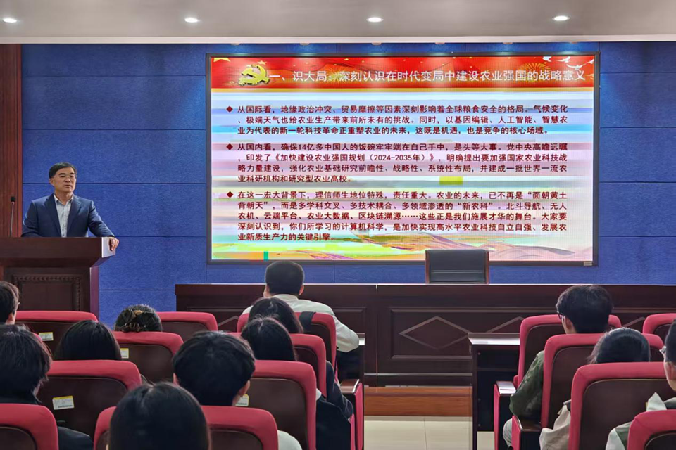 杨凯指出此次党课聚焦建设农业强国战略需求,围绕“识大局、明责任、见行动”三大方面展开。首先,杨凯从科技革命机遇与挑战、国际粮食安全部署切入,强调了在新时代背景下,计算机科学是加快实现高水平农业科技自立自强、发展农业新质生产力的关键。接着,杨凯明确提出四项任务,包括强化理论武装、精通专业本领、锤炼党性修养以及扎根农业践行服务宗旨。随后,杨凯呼吁同学们以实际行动展现良好形象,争做政治坚定的“明白人”、数字兴农的“实干家”、遵纪守规的“示范者”和服务师生的“贴心人”。最后,杨凯详细解读了发展党员工作全流程,为同学们早日成为合格党员筑牢基础。