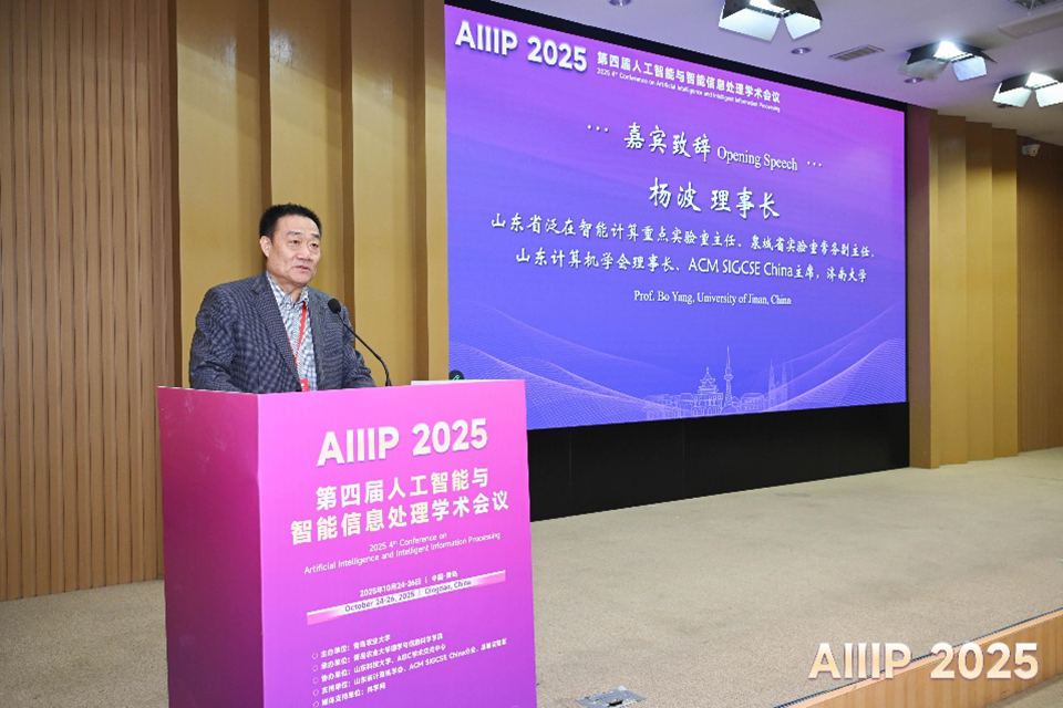 随后,大会主席、山东省泛在智能计算重点实验室主任、泉城省实验室常务副主任、山东计算机学会理事长、ACM SIGCSE China主席,济南大学 杨波教授发表致辞,阐述了AIIIP系列会议在促进学科交叉融合、激发创新思维方面的重要意义,并预祝大会取得丰硕成果!