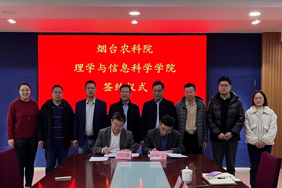 为深入贯彻落实国家创新驱动发展战略,深化产教融合、协同育人,3月3日,青岛农业大学理学与信息科学学院与山东省烟台市农业科学研究院正式签署合作协议,旨在共建研究生联合培养基地,携手共育高层次创新人才。青岛农业大学理学与信息科学学院党委书记杨凯、院长韩仲志、副院长李吉忠,山东省烟台市农业科学研究院党委书记兼院长刘民晓、副院长辛国胜、智慧农业研究所所长丁朋松、副所长夏秀波等人出席本次签约仪式。