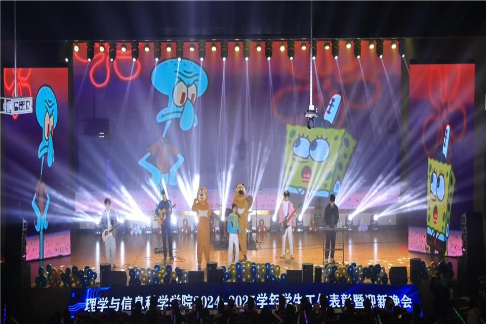 本场晚会分为“理蕴万象・展风华”、“信载初心・绽锋芒”、“卓行逐光・向远方”和“曜映山河・筑荣光”四个篇章,通过多元艺术形式与表彰环节交织,全方位展现理信学院的年度成就与学子风采。晚会以乐队表演《逆旅同行》与舞蹈《Mashup》拉开序幕,激昂旋律奏响青春乐章,动感舞步诠释青年朝气,迅速激活现场氛围。