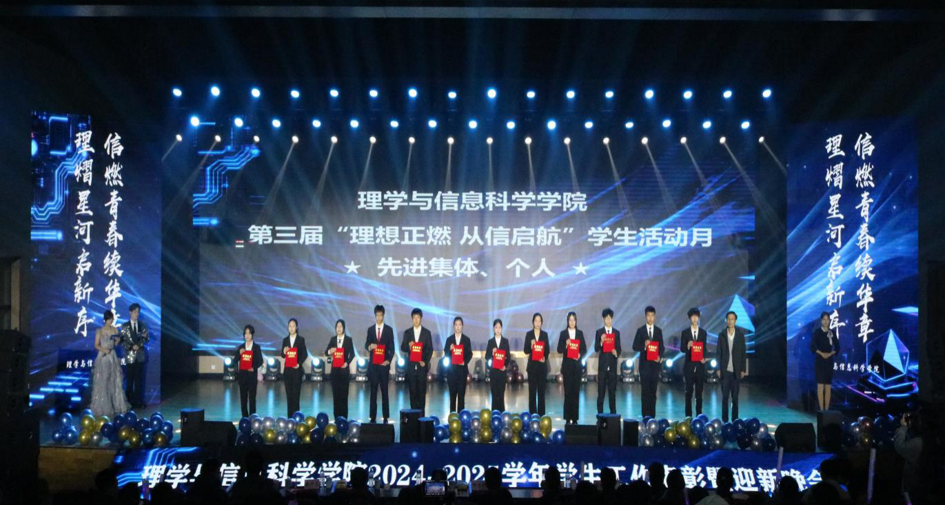 第一篇章“理蕴万象・展风华”以歌曲串烧《声动时光》开篇,学子们以清澈且富有张力的演唱,依次传递对自由的向往、对拼搏的执着与对祖国的热爱;啦啦操《舞动青春》凭借整齐的动作与饱满的状态,展现理信学子积极向上的精神面貌;武术表演《武韵风华》以刚劲拳法与利落招式,融合中华武术的力量与美感,彰显武魂精髓,赢得现场持续掌声。随后,晚会对2024-2025学年学生文体活动先进个人和第三届“理想正燃,从信启航”学生活动月先进个人、集体进行表彰。