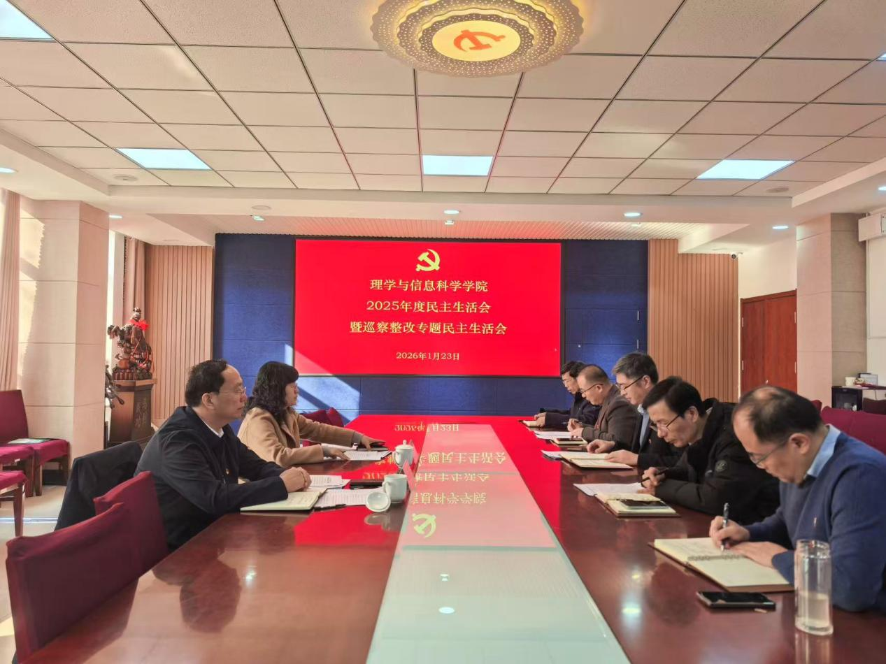 1月23日,理学与信息科学学院党委领导班子在信息楼215会议室召开2025年度民主生活会暨巡察整改专题民主生活会。校党委委员、统战部部长赵龙刚,纪委(监察专员办公室)综合处处长张胜芳,理学与信息科学学院党委全体班子成员参加会议。