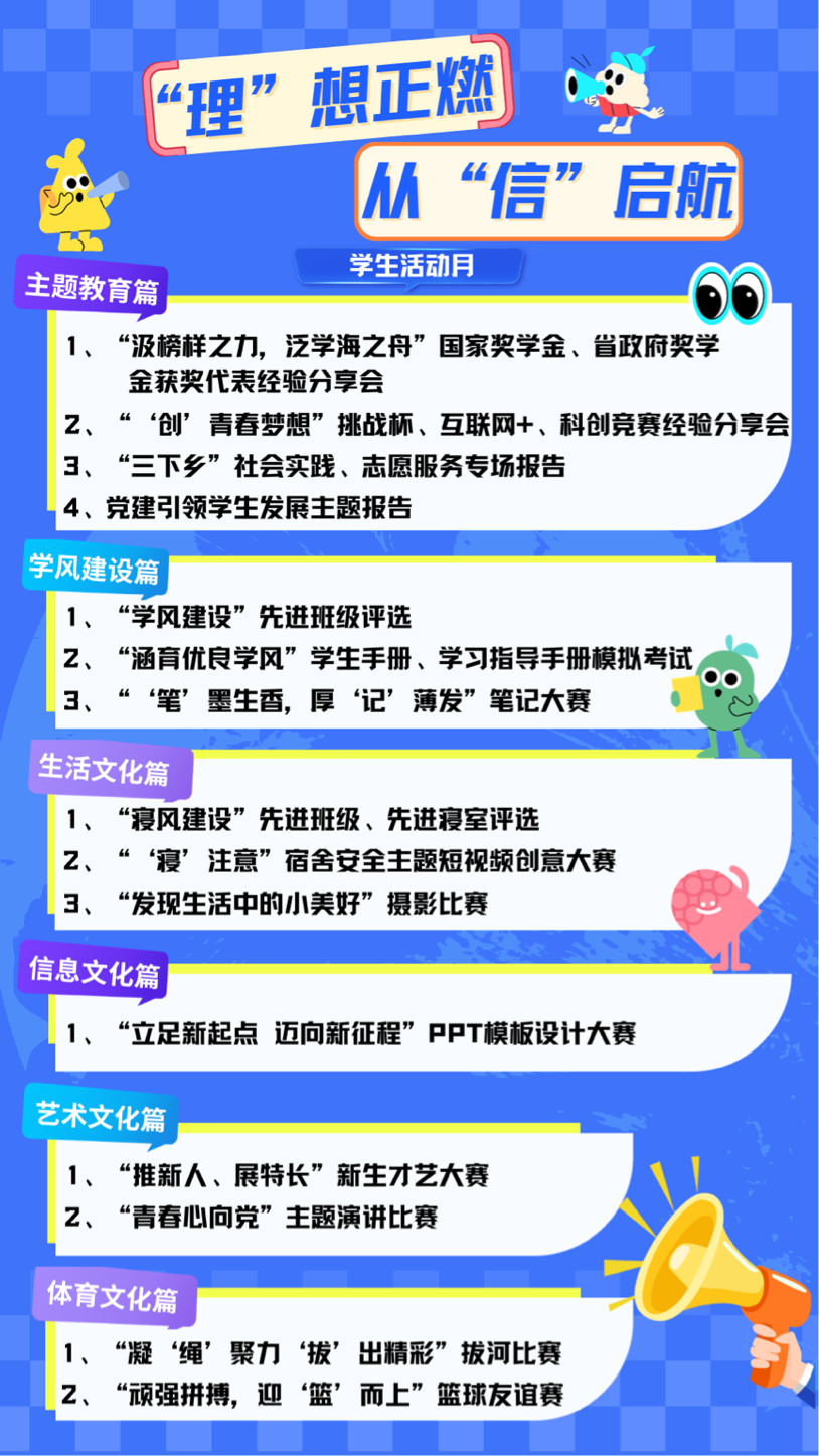 为教育引导学生筑牢理想信念根基,进一步激发专业学习动力,促进学生德智体美劳全面发展,10月中旬至11月下旬,理学与信息科学学院面向平度校区全体学生集中开展了以“‘理’想正燃 从‘信’启航”为主题,以健康向上、丰富多彩的活动为载体的学生活动月。