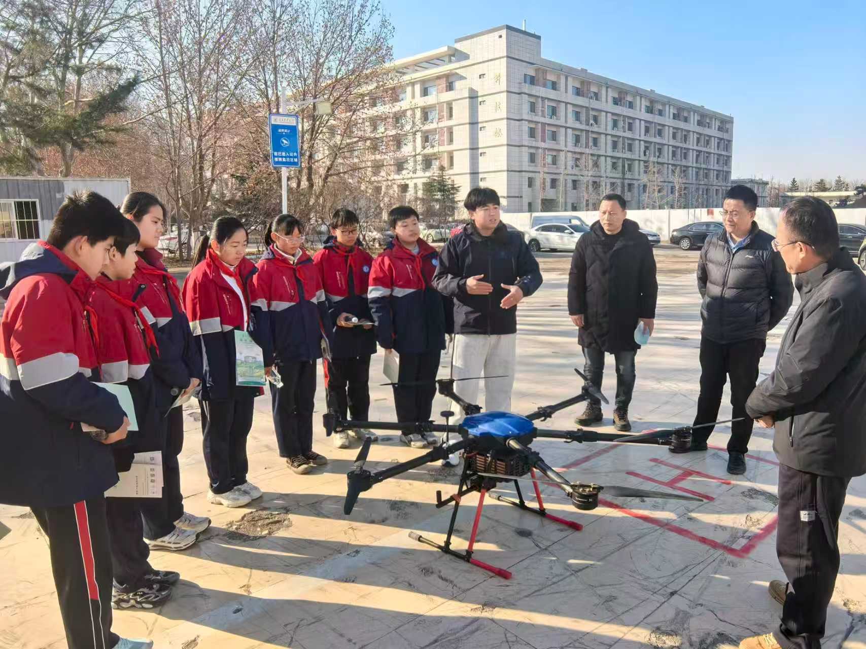 座谈会后,城阳五中师生在学院人员陪同下,实地参观了学院实验室及无人机展示。参观过程中,负责教师细致讲解了相关科研设备的技术原理与应用场景,激发了中学生对信息科学和现代技术的浓厚兴趣。这场生动的“实践课”,将思政教育与科学素养培育相融合,直观展现了高等教育阶段的育人特色与科技创新氛围。