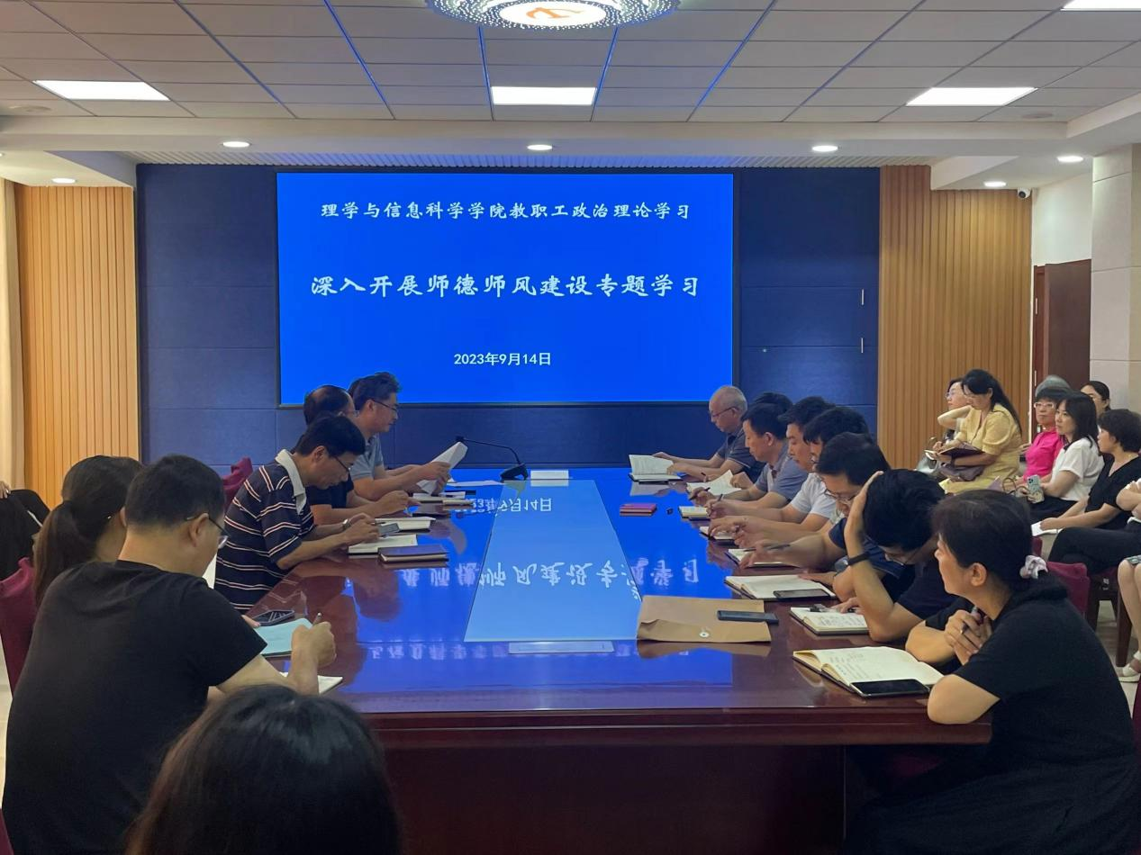为深入学习贯彻习近平新时代中国特色社会主义思想,贯彻学习习近平总书记关于教育的重要论述和指示批示精神,进一步加强师德师风建设,9月14日,理学与信息科学学院开展师德师风建设专题学习,组织教职工在信息楼215集中收看“依法规范执教”师德警示教育片。学院党委书记杨凯,院长徐鹏民,党委副书记、副院长岳斌,副处级组织员陈龙猛,副院长李吉忠、韩仲志、刘振斌及全体教职工参加会议。