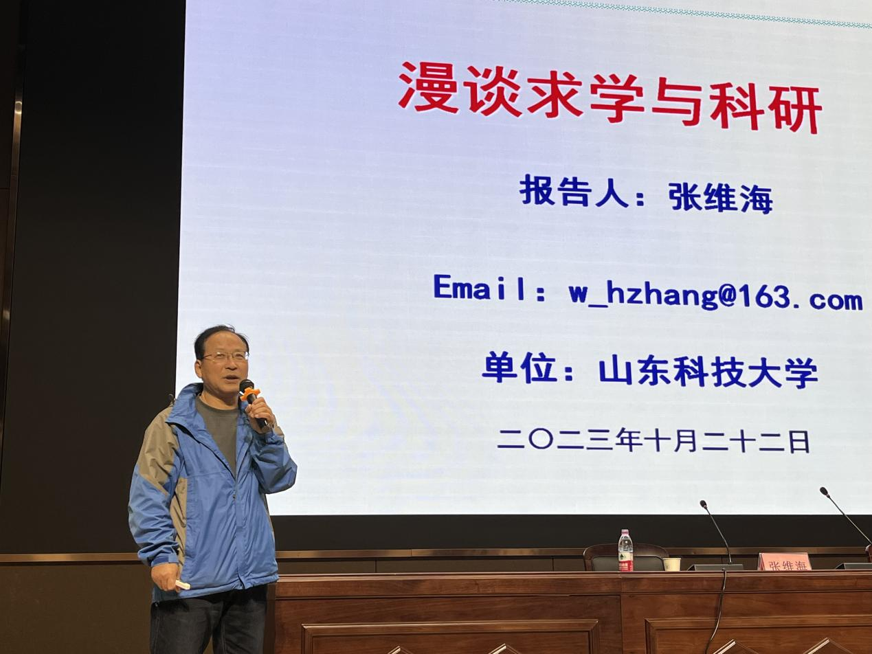 张维海以“漫谈求学与科研”为主题,讲述自己从一名贫困农家子弟到“泰山学者”特聘教授的经历,他勉励同学们勤奋学习,抓住时代机遇,勇敢面对逆境和挑战。他还结合自身的学术经历总结分享了影响科研的内因和外因,鼓励同学们要肯奋斗,方能做得大事成,为理信学子实现理想之路提供了一盏指明灯。