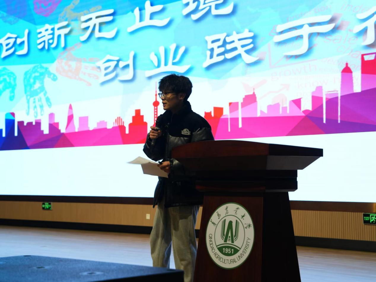 首先,第九届山东省“互联网+”大学生创新创业大赛省级金奖获得团队负责人王绪谦分享了加入实验室科研、参加“挑战杯”“互联网+”等多项竞赛的经验,普及了大学各类竞赛相关知识,分享了自身参加各类竞赛的经验,讲述了大学生参加竞赛的意义,鼓励同学们将所学知识与经济社会发展紧密结合,培养创新思维,增强沟通交流能力和社会实践能力,增强学习能力和动手能力,增强团队意识和抗压能力,积极主动参与各类竞赛。随后,学院创新创业中心主任程天宇结合自己的创新之路与所做的项目分享创赛经验,介绍了关于项目选题、团队成员选择及在项目前、中、后期的工作,讲解了目前创新创业大赛的情况,鼓舞同学们以积极饱满的状态投入到创新创业之路当中。最后,学院创新创业中心副主任魏嘉宁介绍了青岛农业大学大学生创新创业竞赛分类和大学生创新创业项目,详细介绍了“挑战杯”、“互联网+”等高水平赛事,展示了理信学院近年来的科创成果与获奖经历,激励同学们积极参加创新创业活动。